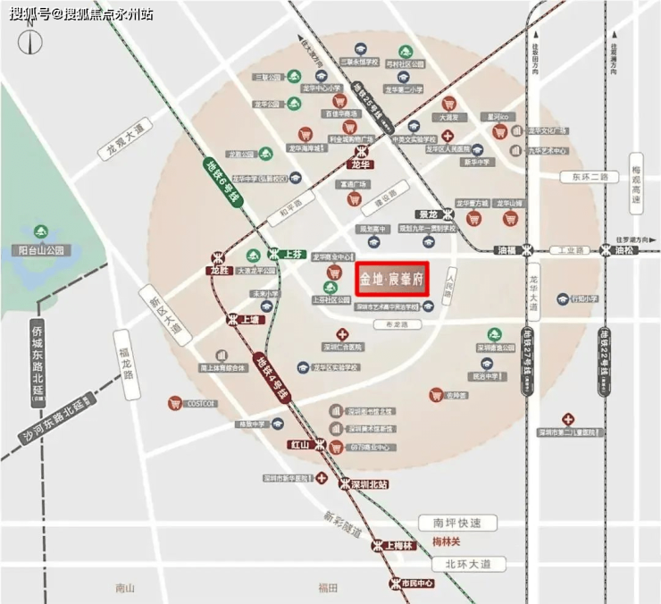 金地宸峯府是金地集团在龙华区打造的又一个楼盘,距离4号线龙华站约1.3公里,鸿荣源尚云的北侧,距离壹方天地C区约250米。