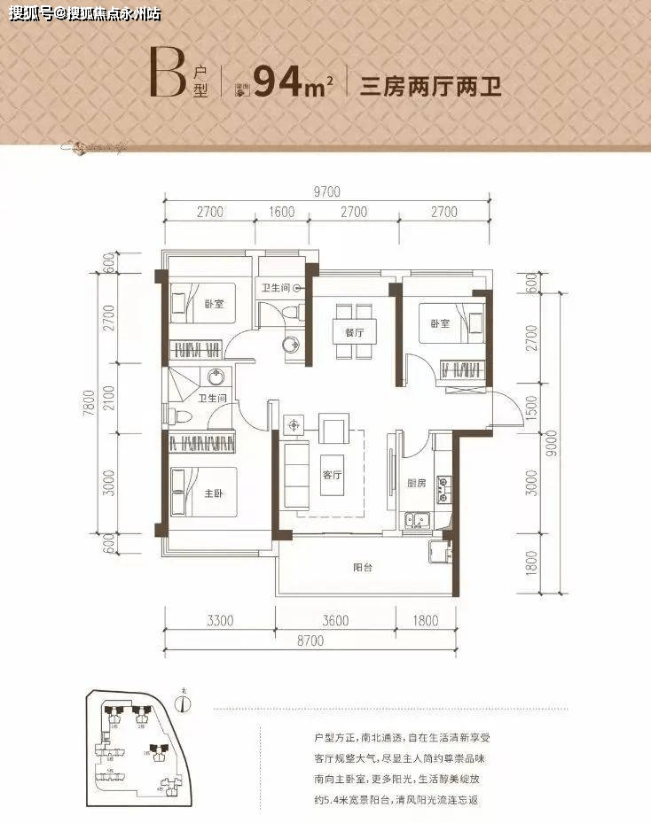 95㎡的3房2厅2卫,设计的竖厅南北通透格局,客厅3.6米开间,动静分区,L型厨房。