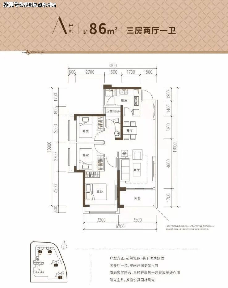 86㎡的3房2厅1卫,设计的竖厅格局,客厅3.5米开间,L型厨房,卫生间三段式分离,正南朝向。