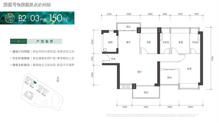 150㎡的4房2厅2卫:设计的是竖厅格局,南北通透双阳台,客厅6.3米大开间,进门入户玄关,4个卧室分别做到了3.5米/2.9米/2.8米/2.8米的宽度,U型厨房,卫生间干湿分离,得房率:72%(不含赠送),客厅阳台主朝西南向。