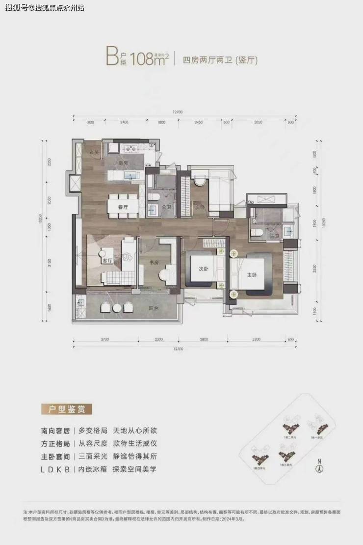 约108㎡的4房2厅2卫:竖厅设计,客厅和次卧之间没有承重墙,业主可以根据自己的喜好和需求进行打造,相当于伴随着家庭的不同阶段扩展出不同功能。