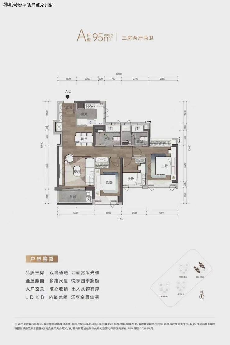 约95㎡的3房2厅2卫户型:公区采用LDKB设计,把客厅、餐厅、厨房、阳台连在一起设计,让每个功能区形成更好地互动与利用,也增加室内空间的阔绰感。