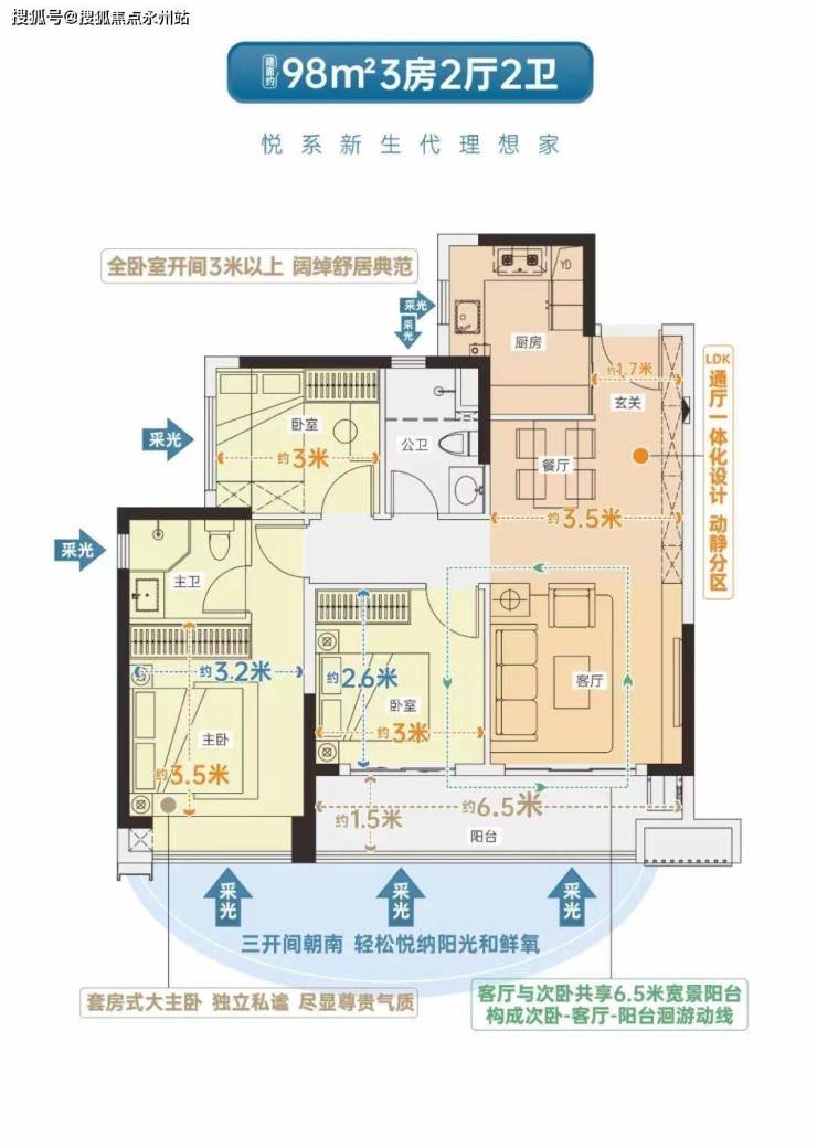 约98㎡3房2卫(1/2/3/4栋03/04户型)传统竖厅格局,动静分区,客厅开间约3.5米,主卧开间约3.2米,两个次卧开间约3米、约2.6米,约6.5米大阳台连接客厅和次卧;03户型西南户型,04户型东南朝向。