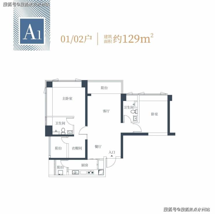 A1户型约129㎡2+1房两卫(1栋1/2单元01/02户型)竖厅格局,餐客一体设计,需要靠封阳台获取+1房,西北朝向。