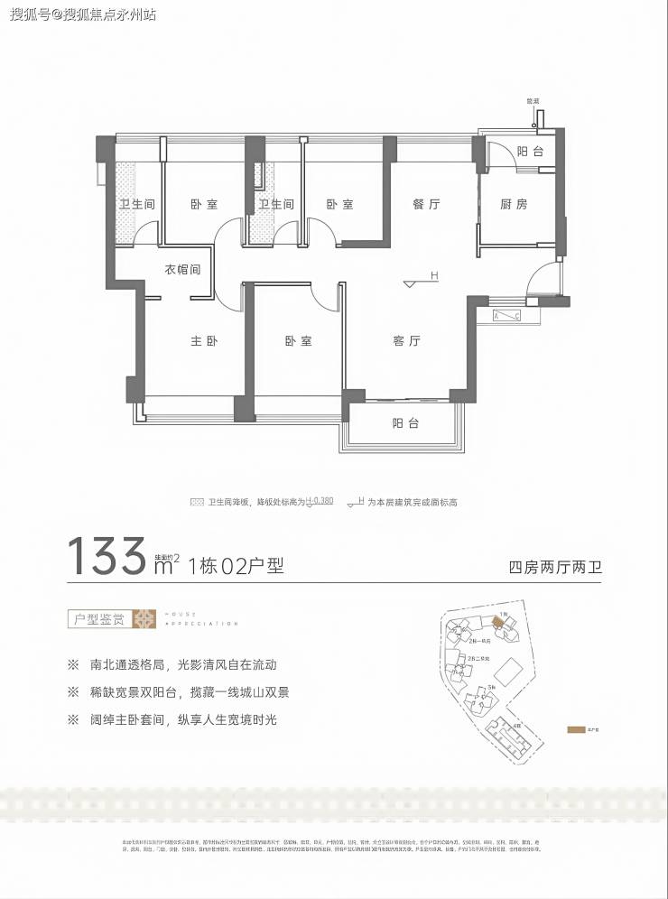 133四房,整体上是110户型的扩大版,多了一个次卧,设计基本一样,南北通,厨房带生活阳台。主卧步入式是衣帽间,更有仪式感,收纳空间也更大。但是主卧飘窗会多出一块墙体,没有110的主卧飘窗好利用,133的主卧面积应该会大些,不用飘窗应该也能放下一张大床,位于1栋西南朝向看花园;竖厅设计,双阳台,四房主卧独立衣帽间。