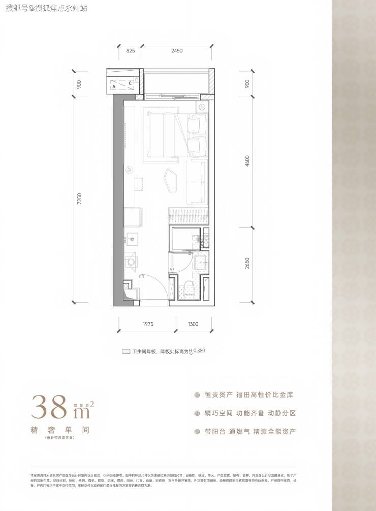 建面约38㎡,麻雀虽小五脏俱全,带阳台通燃气,卫浴干湿分离,房间更防潮,总价1字头,以最低门槛上车福田核心区,预估未来租金水平可达5500元/月。