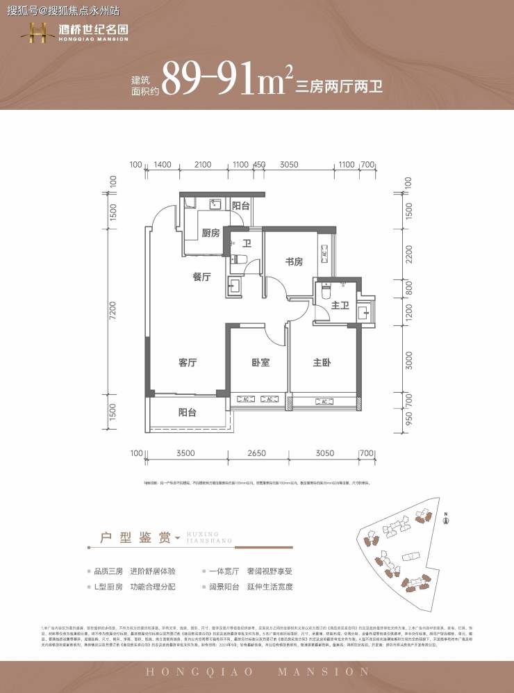 89-91㎡三房两厅两卫:经典竖厅格局,客厅开间3.5米,主卧开间3.05米,L型厨房带生活阳台,公卫三段式分离。部分户型为南北通透设计,阳台主朝正北或东南向,采光通风条件优越。