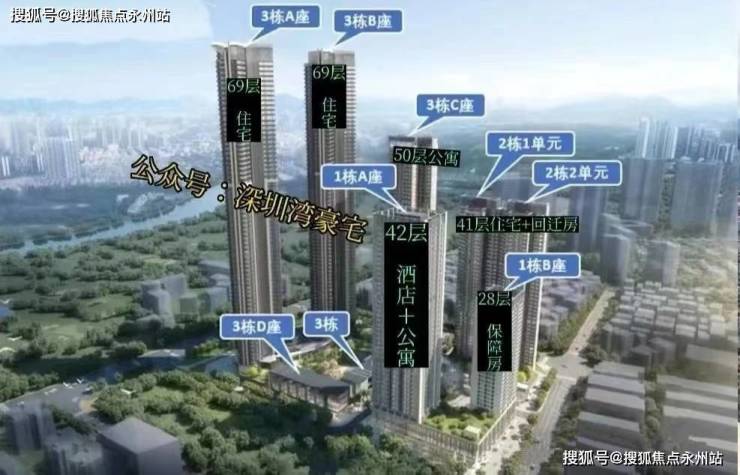总栋数:8栋(1A栋42层酒店+公寓、1B栋28层保障房,2栋1/2单元41层住宅,3A/3B栋69层住宅;3C栋50层公寓、3D栋4层公寓)