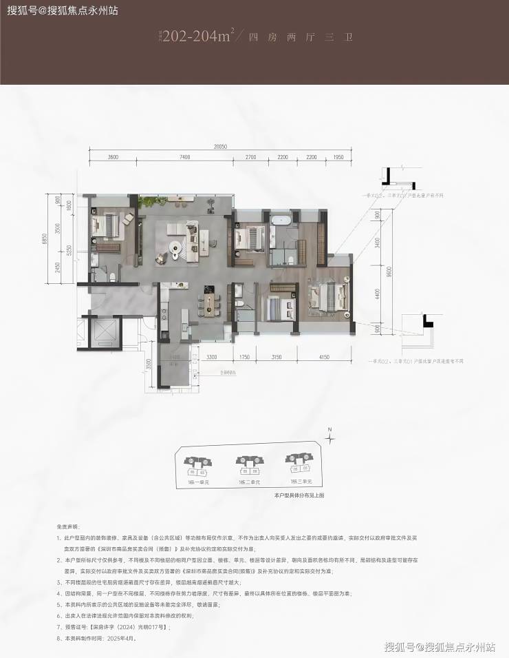 202-204㎡:四房两厅三卫,简装交付,总价约1086-1237万/套