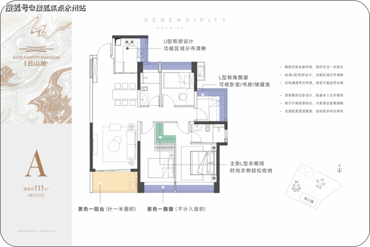 建面111平米:4房2厅2卫,传统的竖厅动静分区户型,分布在3栋04/05户型,东南和西南两种朝向;在南山、福田新房项目对比,项目的得房率很优秀,客厅开间3.6米;主卧还有单独的衣帽间,除去衣帽间和独立卫生间外,可利用的空间在12平米左右,其他房间大小也比较适中;作为南山改善户型,不管是朝向和户型设计方面没有大的瑕疵。