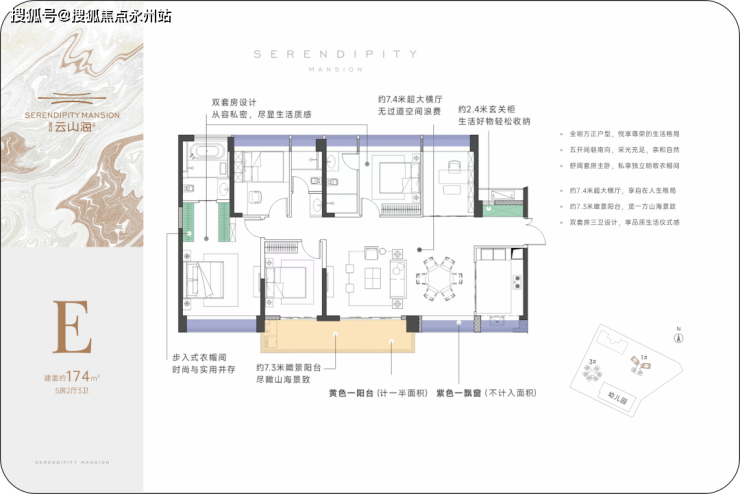 建面174平米:5房2厅3卫,横厅户型,分布在1栋01/02户型,西南朝向;5个房间,有两间是套房,带独立的卫生间;厨房是 L 型设计,比较大气,其他竖厅户型厨房都是 U 型设计
