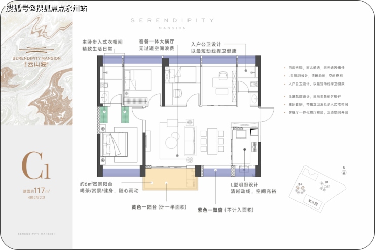 建面117平米:4房2厅2卫,横厅户型,分布在3栋01/02,是所有户型里面空间利用最高的,阳台东南和西南两种朝向,大阳台+大客厅的设计,目前已经有异地的样板间,整体户型没有瑕疵,迎合了当下购房人群体的喜好,特别是得房率方面,对比南山其他项目,可以说是惊喜,总体给人的感觉是:客厅宽敞、主卧比较大,其他次卧面积也不小。