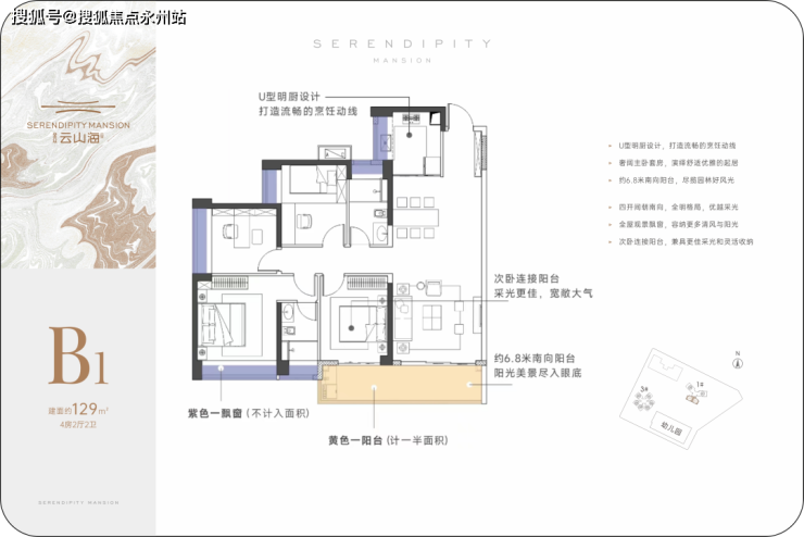 建面129平米:4房2厅2卫,传统的竖厅户型,动静分区,分布在1栋03/04户型,都是西南朝向,可以说是116平米竖厅户型的加强版本,主要的差别是:第一,各个功能间的面积有所增加,比方说客厅开间3.9米,主卧面积更大等,第二,阳台的布局有差别,6.8米长的阳台,链接客厅和次卧,129平米的面积,厨房略显小气。