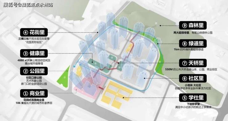 项目规划了约500米的立体城市连廊系统,串联全龄教育、精致商业、品质人居、活力运动、公园休闲等功能板块。