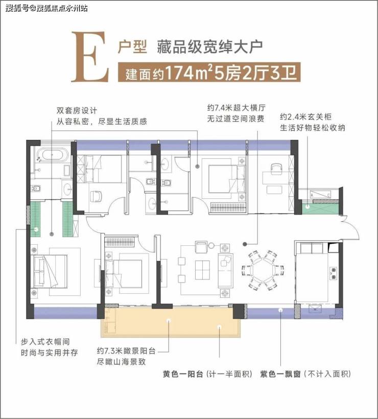 建面约174㎡横厅5房2厅3卫:户型方正,五开间朝南,采用通透性更强、采光面更宽、阳台更阔绰的大横厅设计,约7.4米客餐厅,会客休闲气度非凡。阳台面宽约7.3米,尺度更大,景观面更宽,可随心拥抱自然美景。双套房三卫设计,保证家人的私密起居,奢享尊荣生活格局。
