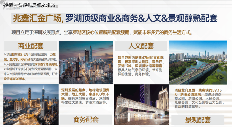 项目傲立于深圳的财富传奇大道,这里是工商银行与建设银行深圳分行的荣耀起点,年利润破千亿。大道两侧,经济繁荣,千亿级产业集群蔚然成风,总部经济、金融业与现代服务业交相辉映,共同编织着深圳的辉煌篇章。兆鑫汇金广场,择址深南大道中轴之上,匠心规划约28万平方米的宏大综合体,以约400米的恢弘尺度,重新定义城市天际线,开启都市生活新纪元。(深圳罗湖兆鑫汇金广场售楼处电话:400-992-0669)