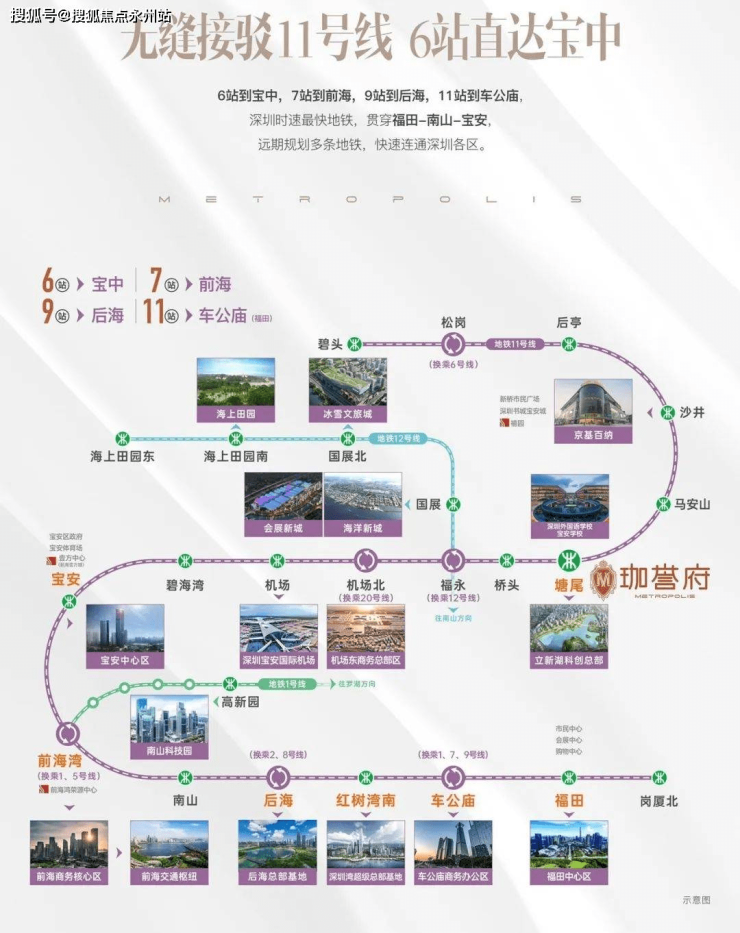 地铁:1.2公里处是11号线【塘尾站】(步行15分钟左右),6站到宝中、7站到前海、9站到后海、11站到车公庙,连通南山、福田