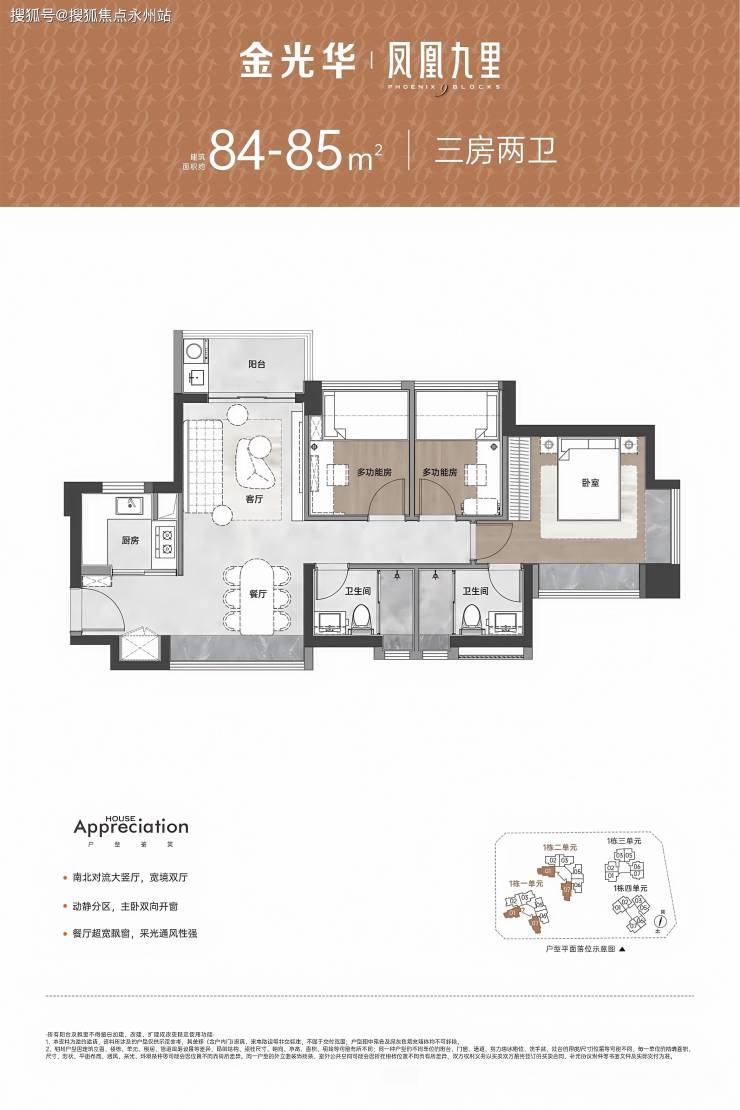 84-85㎡的3房2厅2卫,设计的是竖厅南北通透格局,主卧双飘窗设计,U型厨房,客厅阳台主朝西北、东北向。
