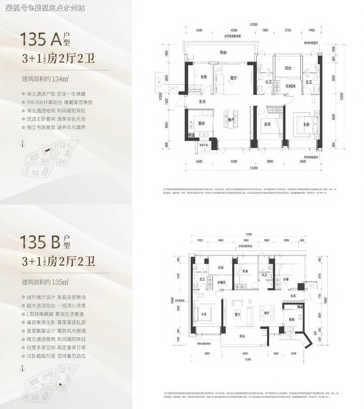 B 户型(135㎡):横厅南北通透,客餐厅 7.2 米开间,四开间朝南,主卧 19.08㎡,次卧 14.3㎡,阳台 6.8 米,西南朝向,适合多孩家庭。