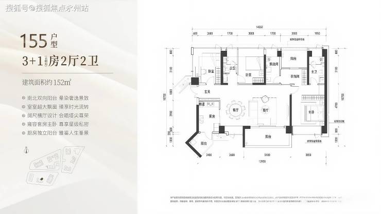 152㎡户型:横厅设计,客餐厅 7.7 米开间,四卧室朝南,主卧 21.17㎡,L 型厨房带生活阳台,东南朝向,得房率约 90%。