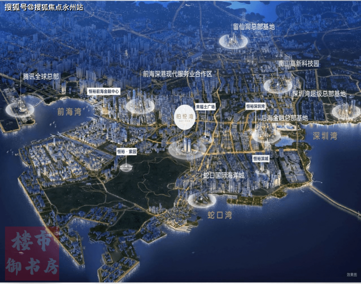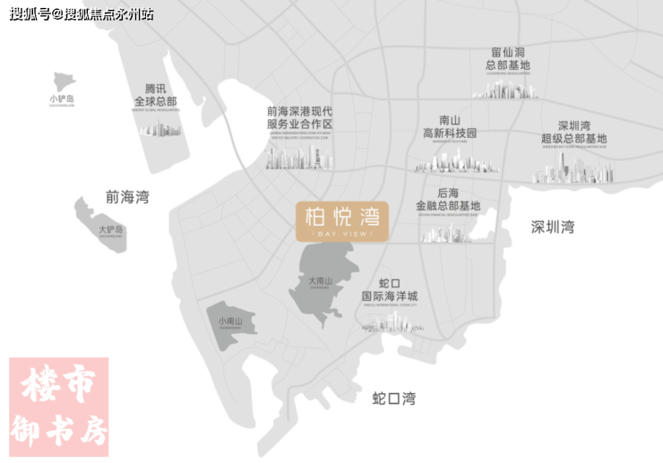 柏悦湾除三湾环抱之外,周边还有 七大总部基地环绕,这七大总部基地的名字,每一个都如雷贯耳—— 后海、前海、蛇口、深超总、科技园、腾讯岛、留仙洞。