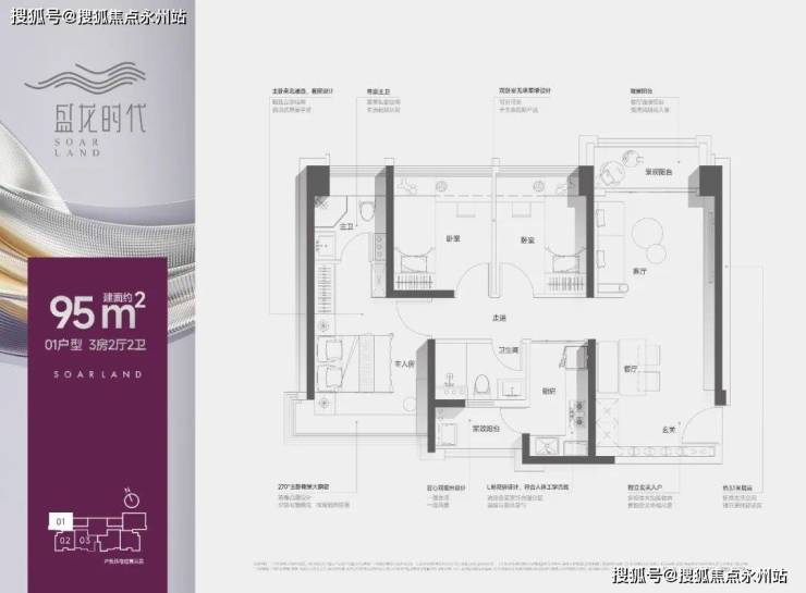 95㎡的3房2厅2卫,1栋C座01户型,设计的是经典竖厅格局,客厅3.35米开间,进门入户玄关,餐客厅一体化,主卧套间设计,L型厨房带1个生活阳台,卫生间干湿分离,得房率:约78%(不含赠送),阳台东北朝向。