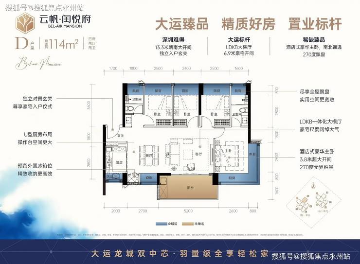 尺度升级:经典大横厅设计,LDKB 一体化开间 6.9 米,客厅带 5.2 米大阳台,主卧套房含衣帽间及独立卫浴,全屋飘窗数量达 9 个(卧室、厨房、卫生间均有)。