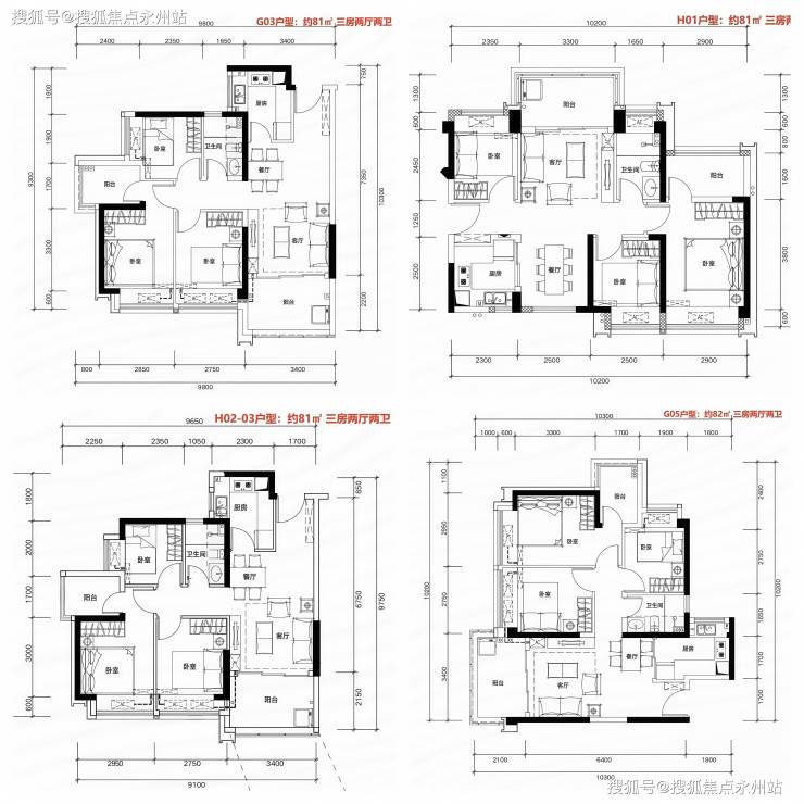 81-82m²3房2厅2卫,有竖厅和南北通户型,客厅开间3.3-3.4米,都有阳台改主卫以及增加客厅进深改造,赠送后得房率在92%左右。