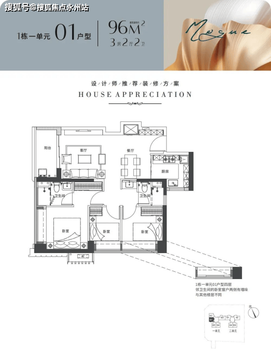 建面96-102平米:3房2厅2卫都是传统的竖厅,动静分区格局。