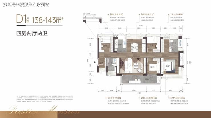 138-143㎡四房:横厅设计,南北通透,7.5米超长阳台,主套间配备步入式衣帽间,适合改善型家庭。