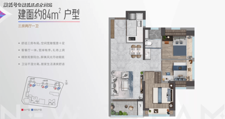 商品房建面:约69㎡2房2厅1卫、约84㎡3房2厅1卫、约94㎡3房2厅2卫