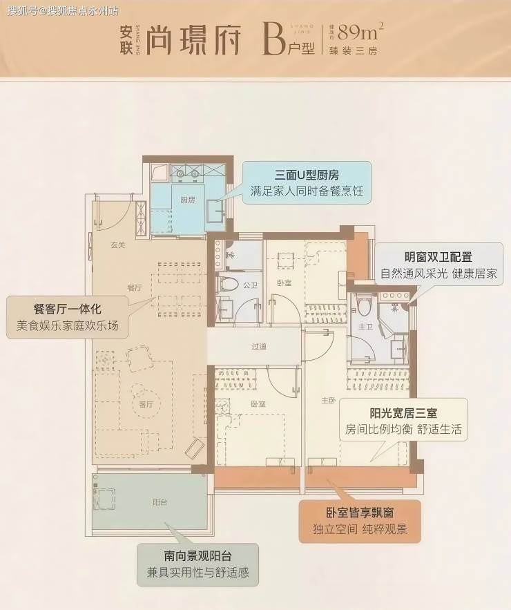 89㎡三房两厅两卫:动静分区明确,客餐厅与厨房一体化设计,直通开间约3.5米、进深1.8米的大阳台。