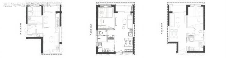 目前在售的商务公寓户型包括44㎡的1房、53-56㎡的1房以及63-65㎡和71㎡的2房2厅1卫。