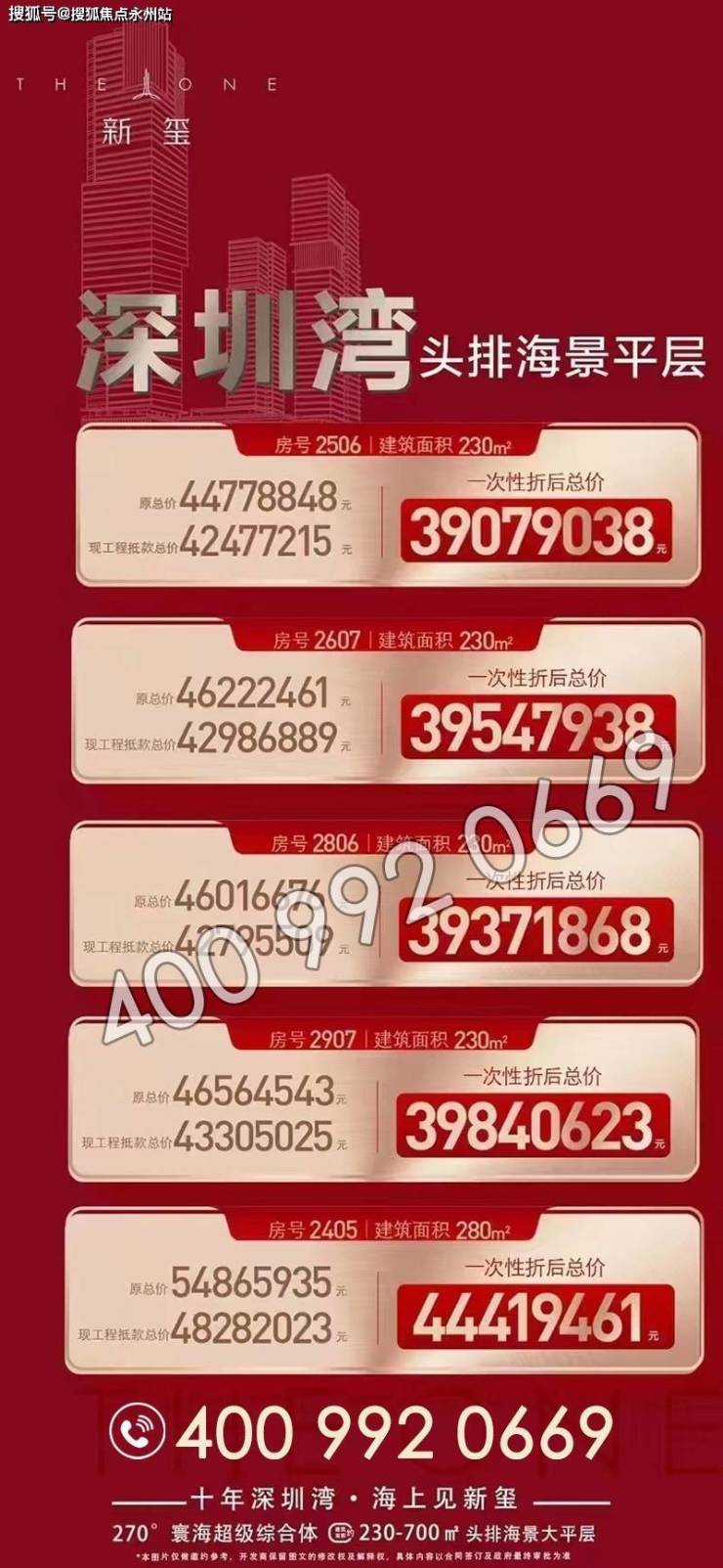 最新动态:当前我们项目在售建面约230-700㎡面积段,具体剩余楼层、户型、朝向欢迎咨询深圳华侨城新玺开发商售楼处电话:400-992-0669(中介勿扰),预约看房价格可以更优惠,下面是我们项目近期推出的几套一口价房源,详情请咨询售楼处电话了解最新动态。