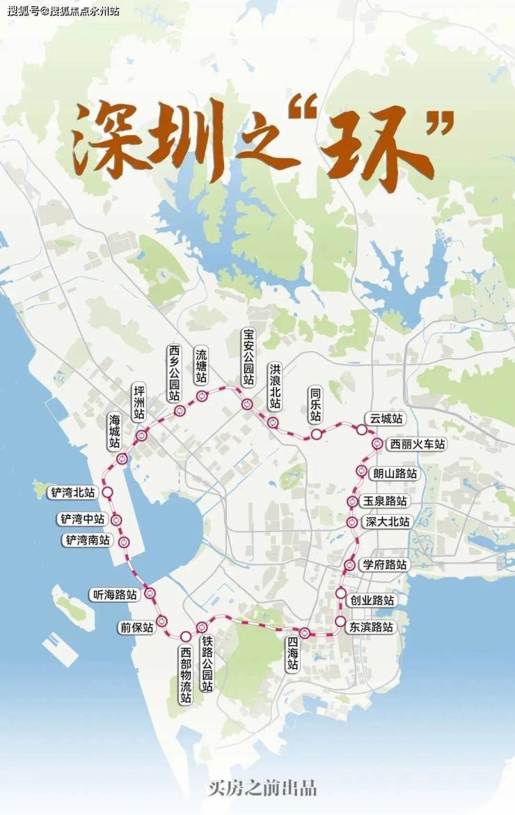 其中,地铁15号线名列前排,作为深圳首条环状地铁,全长约30公里,根据规划,其线路起终点均为前海,“在前海画一个圈”跃然纸上,串联起前海、后海、腾讯企鹅岛、科技园、宝中等西部高含金量区域,堪称深圳西部“一环”。