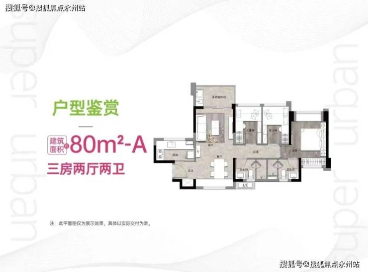 建面80平米:3房2厅2卫,传统的竖厅户型,动静分区的格局,不包括赠送的情况下得房率在80%以上;三个房间和客厅属于同一个朝向,这种户型在采光方面是最优秀的,特别是东南和西南朝向,当然,这种设计导致走道过长,有比较大的面积让费;80平米3房2卫,户型整体很紧凑,各个功能间勉强够用,能有这样的设计属实不易。