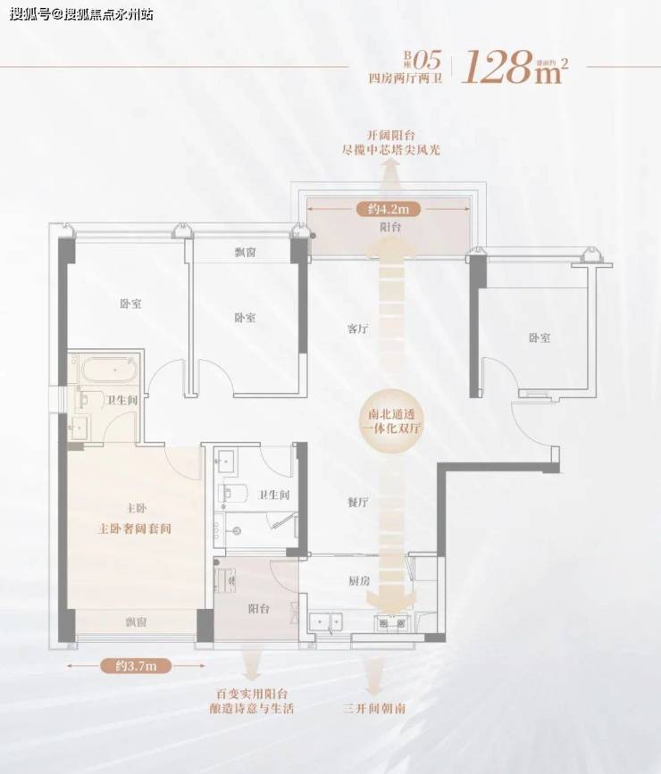 天宸128㎡户型图,双卫浴、双阳台设计,主卧大套房,空间开阔。
