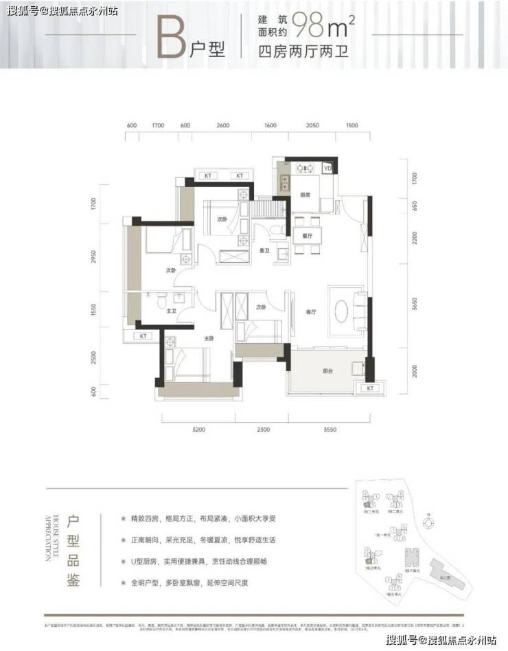 98㎡的4房2卫,设计的正南向竖厅格局,客厅3.55米开间。