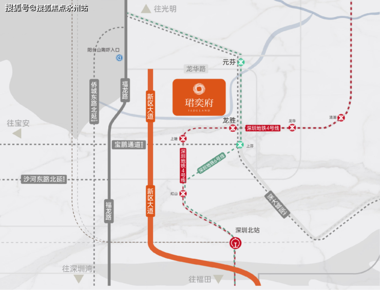 4干道:福龙路快速路,畅达福田中心;侨城东路北延(在建中)、沙河东路北延(规划中)、宝鹏通道(规划中)畅达南山、宝安,节省约20%通勤效率。