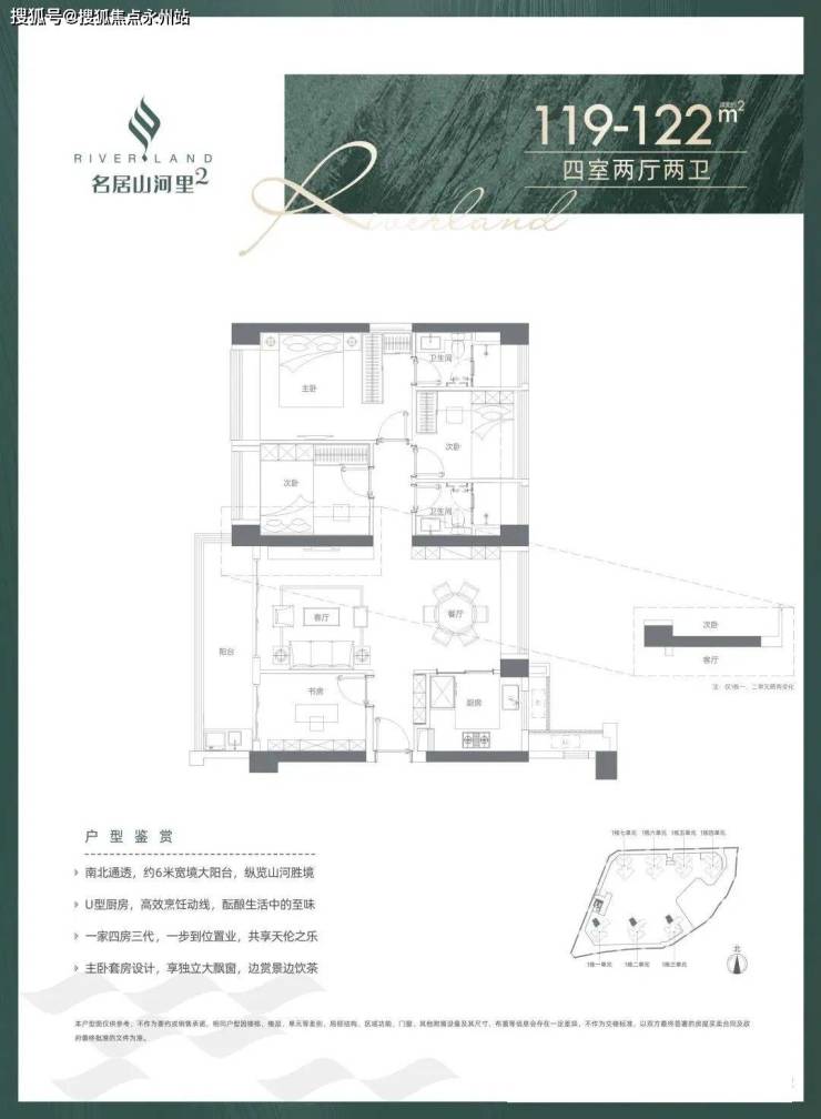 119-122㎡四室两厅两卫(02户型)设计的是竖厅格局,客厅3.5米开间,南北通透,四开间朝南,全屋飘窗,U型厨房,得房率:71.36%(不含赠送),阳台1.5米进深,主朝西南向。