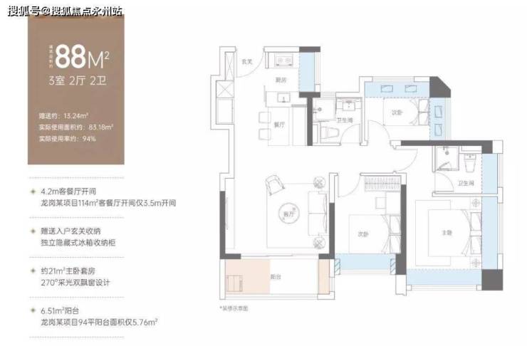 88㎡的客厅开间做到约4.2米,堪比市面上100多㎡的户型,整个空间通透宽敞。