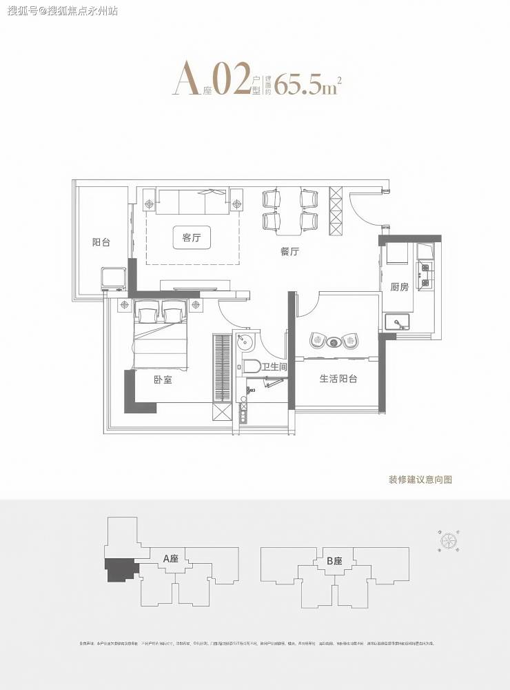 建面约65.5㎡(A座02户型),西南朝向,总价约468万-497万元。