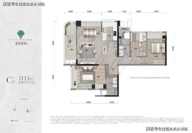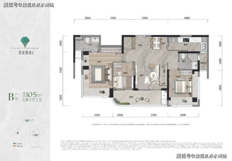 105㎡的3房2厅2卫,设计的是竖厅类双龙抱珠格局,客厅3.5米开间,LDKB一体化设计,四开间朝南,3个卧室分别做到了主卧20.8㎡/次卧11.49㎡/次卧6.52㎡(实测面积),客厅连接次卧出6.1米长的大阳台,L型厨房,卫生间干湿分离,得房率约95%(包含赠送),东南朝向。
