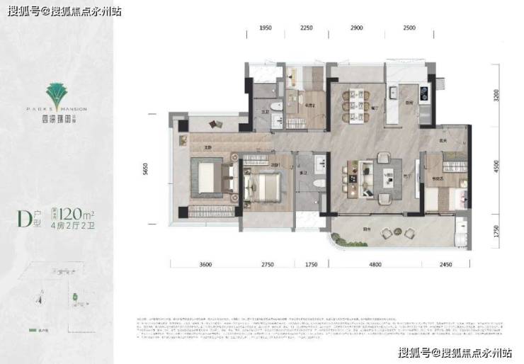 120㎡的4房2厅2卫,D户型,设计的是竖厅南北通透格局,进门入户玄关,客厅4.8米开间,LDKB一体化设计,五开间朝南,4个卧室分别做到了主卧18.9㎡/次卧10.2㎡/次卧6.77㎡/次卧6.4㎡(实测面积),客厅连接次卧出7.25米长的巨幕大阳台,U型厨房,卫生间干湿分离,得房率约95%(包含赠送),阳台主朝西南向。