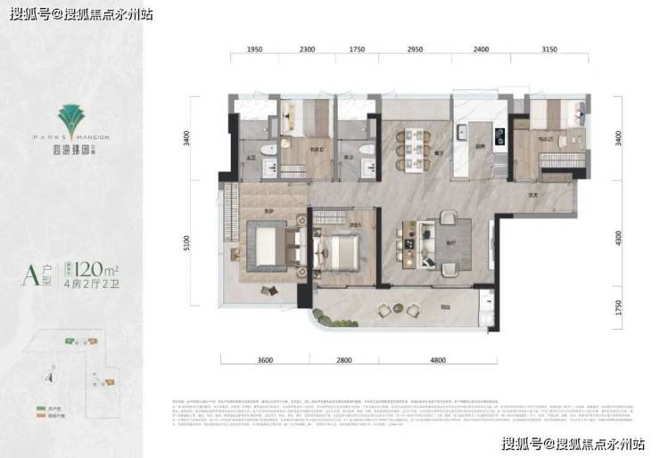 120㎡的4房2厅2卫,A户型,设计的是竖厅南北通透格局,进门入户玄关,客厅4.8米开间,LDKB一体化设计,4个卧室分别做到了主卧16.34㎡/次卧8.37㎡/次卧7.93㎡/次卧6.93㎡(实测面积),客厅连接次卧出7.6米长的巨幕大阳台,U型厨房,卫生间干湿分离,得房率约95%(包含赠送),阳台主朝东南向。