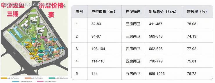 「中洲迎玺3期」推售户型有82-94-96㎡的3房2卫,103-113-115的4房2卫,144㎡的5房2卫户型,价格备案均价7.17万/㎡,备案单价5.64-8.08万/㎡,总价466-1162万/套,计划将在2027年9月30日精装交付。