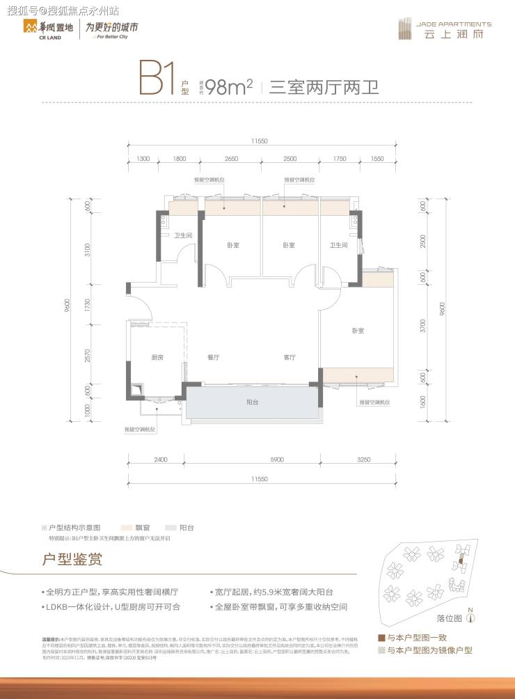 98㎡的3房2厅2卫,B1户型,设计的是横厅南北通透格局,客餐厅5.9米开间,LDKB一体化,3个卧室分别做到了3.25米/2.65米/2.5米的宽度,U型厨房,公卫三段式分离设计,得房率81.23%(不含赠送),阳台主朝东南向。