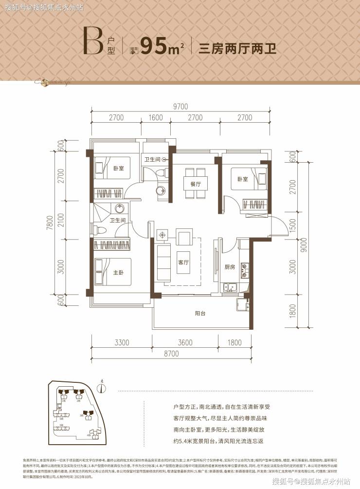 95㎡的3房2厅2卫,设计的竖厅南北通透格局,客厅3.6米开间,动静分区,L型厨房。