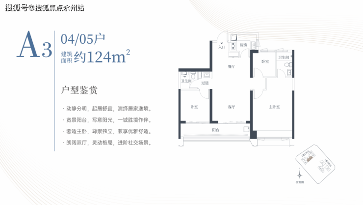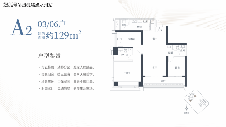 129㎡3房2卫A2户型,竖厅双龙抱珠格局,相比A1户型阳台更大一些,直接连通到次卧,东南朝向,得房率在77%左右。