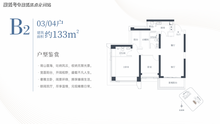 133㎡三房两卫,竖厅设计,得房率72%左右,西南朝向。